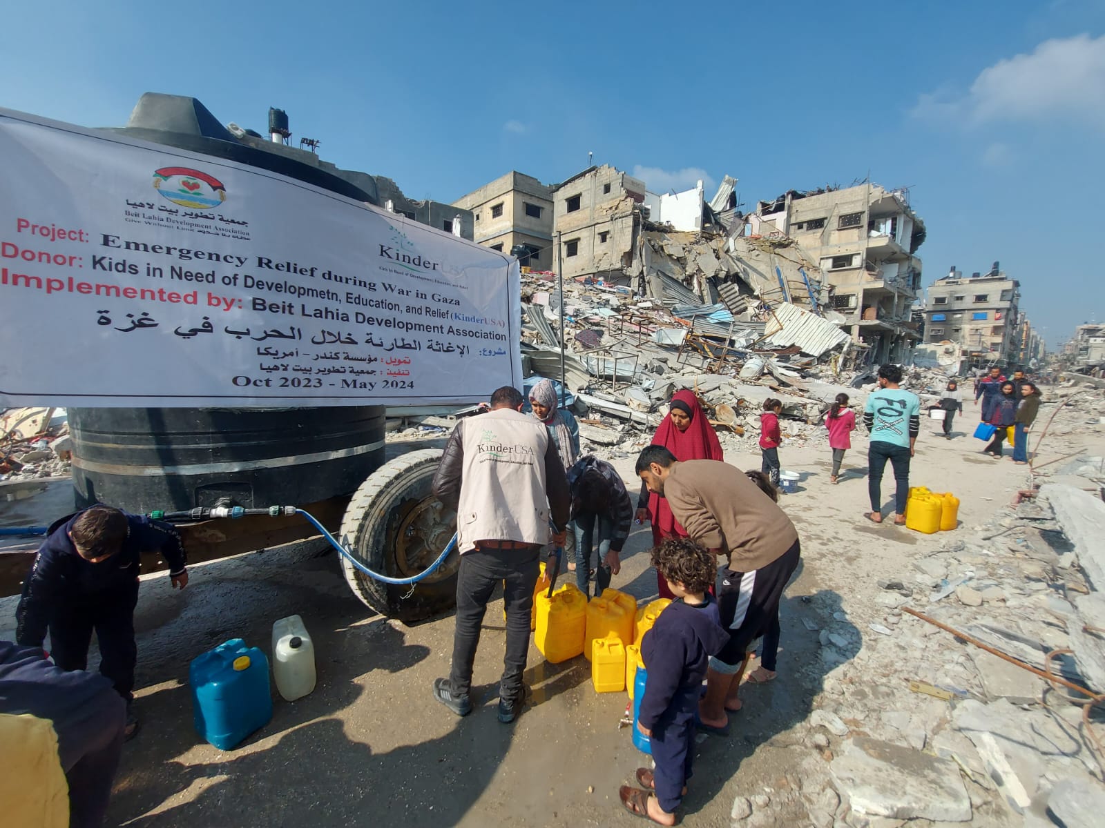 The Beit Lahia Development Association launched an emergency assistance program to provide 110,000 liters of clean drinking water to affected families in the northern parts of the Gaza Strip as a humanitarian response to the suffering of the local population. With kind financing from the Kinder America Foundation, this project was implemented as part of the emergency relief effort during the Gaza War.